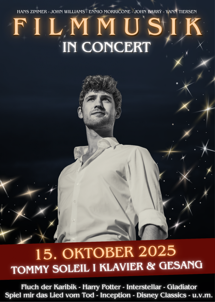 In seinen eigenen Arrangements bringt der junge Pianist Tommy Soleil  bekannte Filmmelodien von Hans Zimmer, Ennio Morricone, John Williams u.a. auf die Bühne.